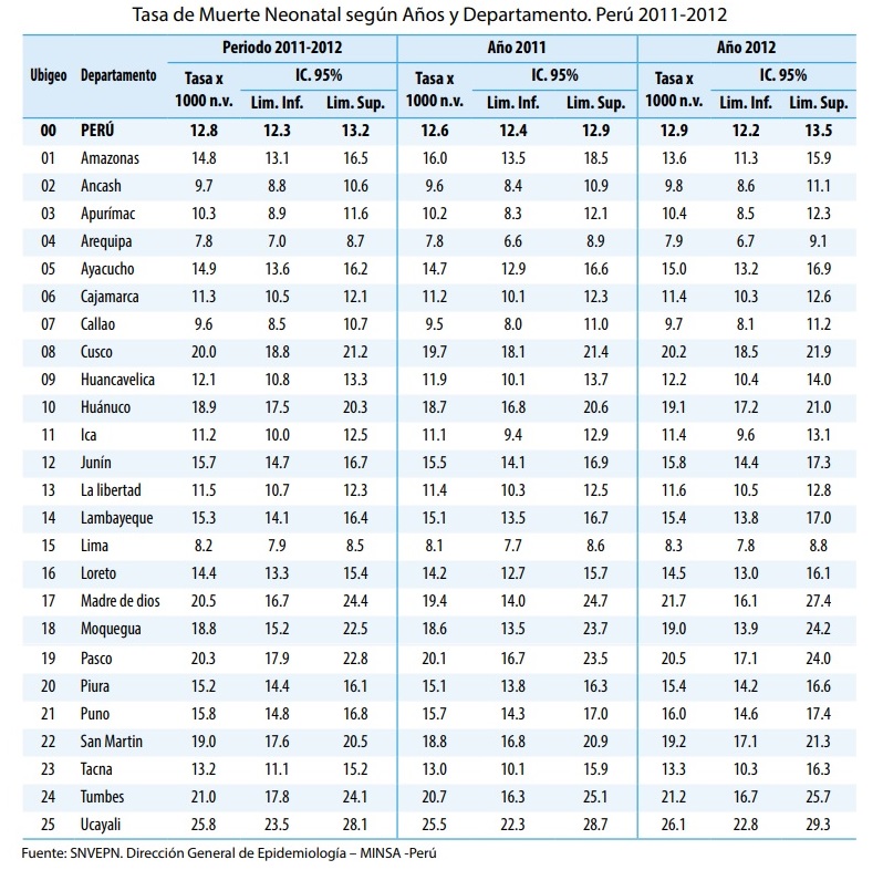 Dirección general de Epidemiología, 2012, Mortalidad Neonatal en el Perú y sus Departamentos, Recuperado de: https://www.unicef.org/peru/spanish/Mortalidad-Neonatal-en-el-Peru-y-sus-departamentos-2011-2012.pdf